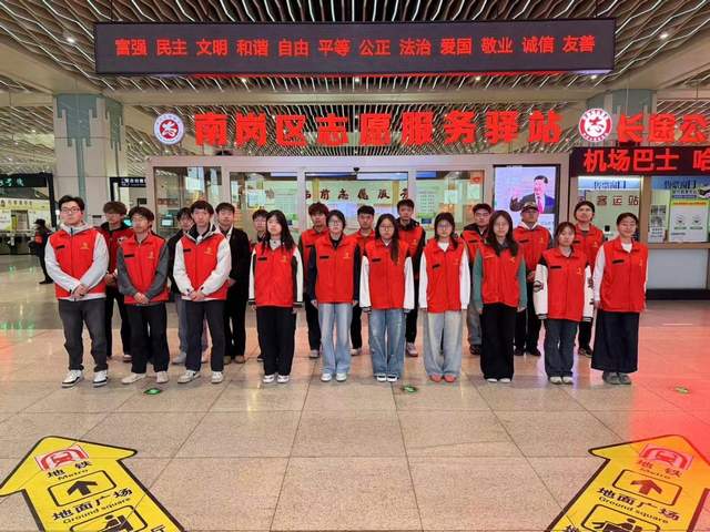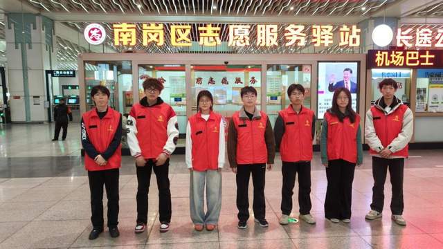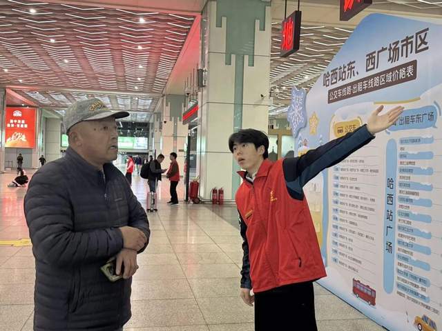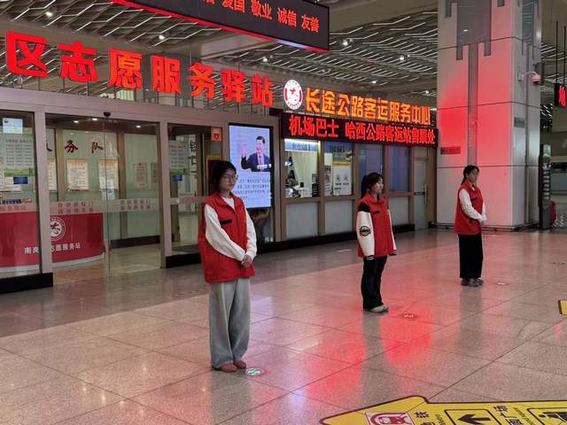 在南岗区志愿服务驿站前,志愿者们以昂扬状态提供咨询引导、便民帮扶等服务,成为交通枢纽中一抹亮眼的志愿红。